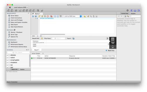 午前中からの続きです。 MySQLWorkbenchを起動できたら、左側のMANAGEMENTにあるServer Statusをクリックするとデータベースの状況がわかるとのことです。 とりあえず試しにデーターベースの一覧を取得してみます。 > SHOW DATABASES; 12:20:54 Get schemata…